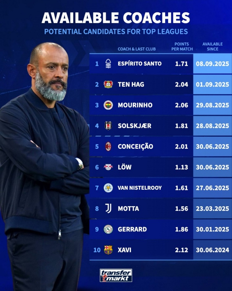 9月10日讯 德国转会市场盘点了目前赋闲的教练,穆里尼奥、滕哈赫、哈维、努诺在列。